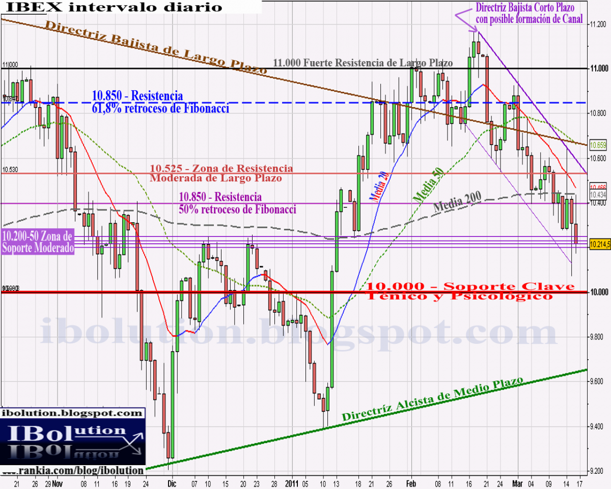 - 10.415 Resistencia debida al nivel 50% de Fibonacci medidos desde los máximos de Enero de 2010. Coincidiendo en la misma zona con la Media de 200, por lo que suman sus fuerzas. La superación de ésta zona es clave.