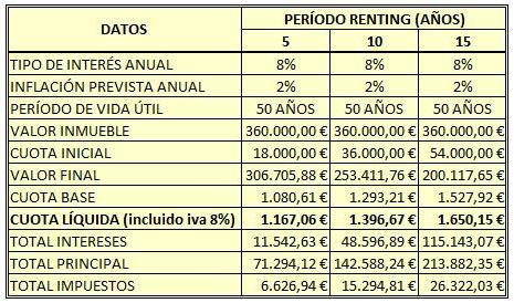 Así tendríamos que en un “renting” de esta vivienda a 5 años, deberíamos desembolsar una cuota inicial de 18.000 euros y 60 cuotas de 1.080,61 euros, cantidades a las que habría que sumar el I.V.A. vigente. La entidad cedente (financiera o inmobiliaria) ingresaría 11.542, 63 € en concepto de intereses y 71.294,12 en concepto de principal, más la cuota inicial de 18.000 €. A su vez Hacienda recaudaría en concepto de impuestos, 6.626,94 €. La propiedad del bien inmueble durante el período de los cinco años sería, lógicamente, del cedente.