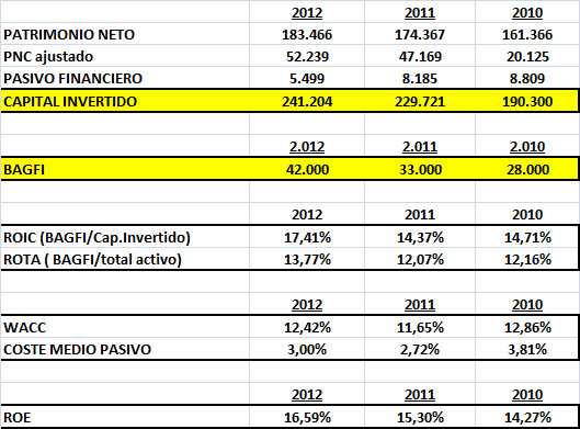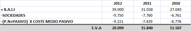 EVA ( CREACCIÓN DE VALOR AÑADIDO). A través de esta mágnitud se aprecia claramente que la compañía está creando e incrementando valor año tras año durante el periodo analizado, lo que significa que a través de su ciclo operativo tiene la capidad suficiente de generar recursos adicionales para autofinanciarse una vez ha retribuido a la hacienda pública y a las distintas fuentes que le están financiando.