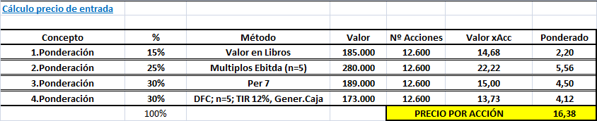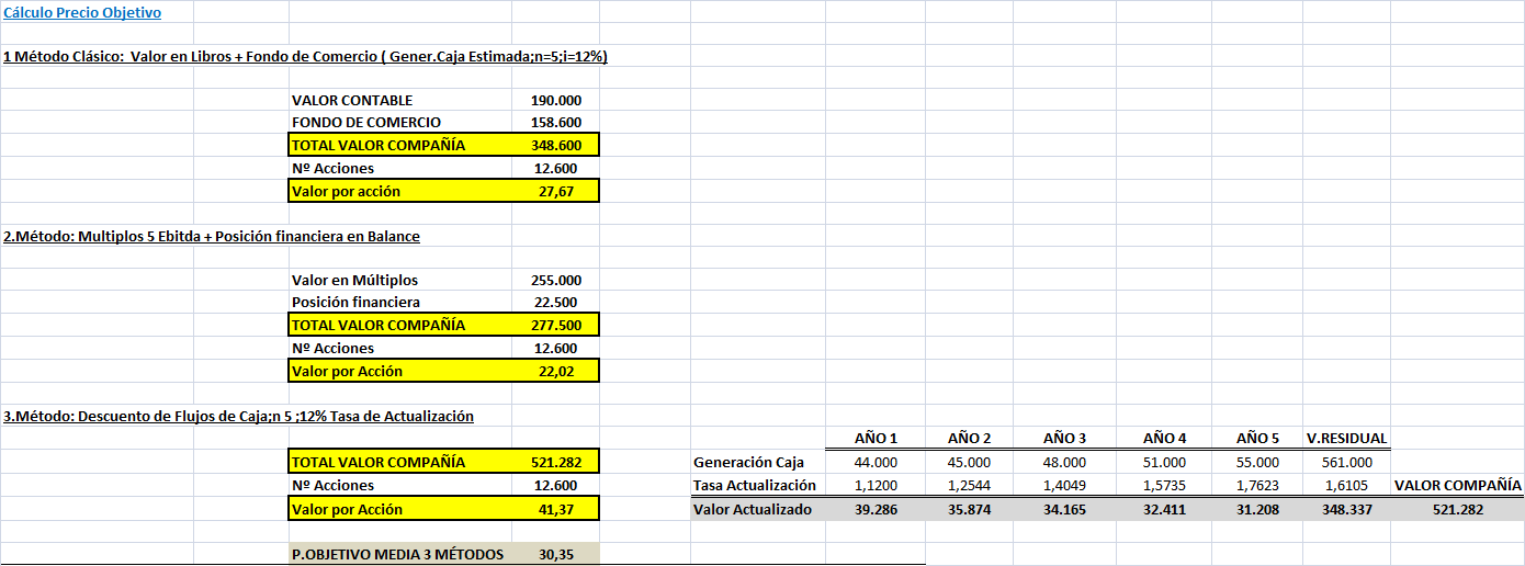 Fijo el precio objetivo, como aquel que podríamos estar dispuesto a pagar con objeto de adquirir la compañía con intención de mantener la inversión de manera permanente. El 1er método valoraría a la compañía por el importe de los activos contabilizados en su balance, una vez de deducido sus pasivos, añadiendo aquel fondo de comercio que no figura en sus registros contables y cuya determinación se establecería medainte el descuento de flujos de caja sobre un horizonte temporal de 5 años y una tasa de descuento de un 12%. Con el segundo método de valoración, se paga la caja neta de la compañía ( activos financieros equivalentes en tesorería a largo plazo y corto plazo - deuda financiera que generá coste financiero) más la estimación del resultado operativo ajustado a caja 5 veces. Y finalmente el tercer método se efectua mediante el descuento de flujo de caja, tomado como flujo de caja el beneficio neto ajustado por los gastos no desembolsables y los ingresos no embolsables descontados a una tasa (Wacc) del 12% y un plazo de 5 años con valor residual.