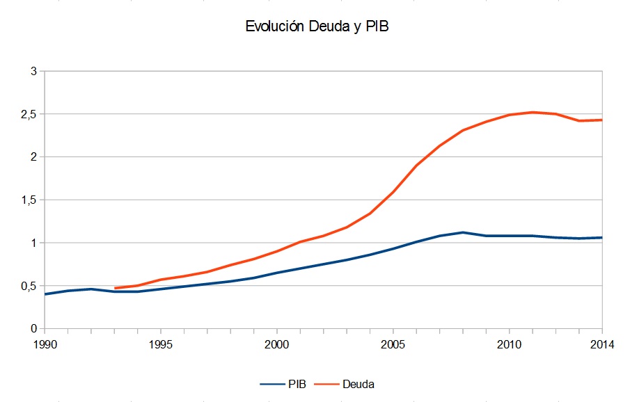 En la siguiente gráfica pueden ver la evolución del PIB nominal español y de la Deuda asumida por las familias, empresas y Administraciones Públicas. En ella pueden ver como ha tenido que crecer mucho la deuda para que la economía pueda crecer, de forma que hemos llegado a la situación actual en el que el volumen de la deuda ya es tan alto que es imposible seguir ta tendencia.
