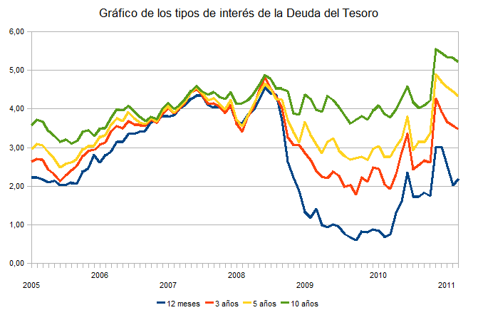 La siguiente gráfica muestra la evolución de la cotización en cierre mensual de los tipos de interés de la Deuda del Tesoro en el Mercado Secundario actualizada al 31 de Marzo de 2011. Después de la espectacular subida, efecto de la presión de los mercados internacionales producida hace unos meses ahora con las noticias de los nuevos test de estrés la tensión se ha relajado y disminuye el coste de financiación de la deuda para el Estado, y el diferencial con el bono alemán a 10 años se ha situado por debajo de los 190 puntos básicos. Se ve claramente que es en los vencimientos más cortos donde la corrección es mayor, Ahora falta saber como se van a tomar los mercados el problema de la CAM y la noticia de la renuncia de Zapatero a presentarse a las próximas elecciones de 2012.