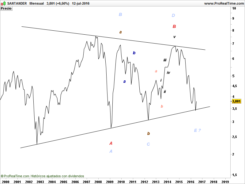 Aquí vemos la estructura que venía señalando como posible triángulo de largo plazo (gráfico mensual a cierres). Si estamos en éste caso, la etiqueta correcta sería ABCDE (azul) de momento sólo rebote, aún falta mucho para determinar un cambio y descartar así el escenario más bajista (rojo) donde C sería igual 100 % de A, mínimos del 2002 como referencia . Aquí el SAN, ha dejado claro el nivel, de ... " Enséñame la pasta "