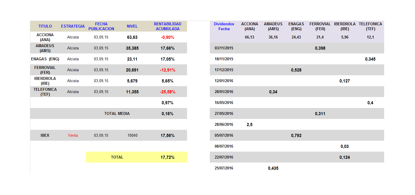Con la configuración actual, estaríamos en una posición dominante respecto al mercado y su benchmark (Ibex Total Return), puesto que éste pierde un 13,89 % desde la apertura de posiciones, observamos un diferencial del 31,61 % a nuestro favor, ahí es nada.