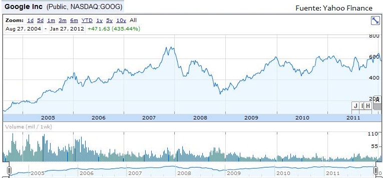 En definitiva Google es una tremenda empresa de la que podemos esperar cualquier cosa. Con sólo 14 años de historia, es uno de mayores “pelotazos” tecnológicos que surgió en pleno pinchado de la burbuja puntocom. Así con todo y aprovechando el cambio euro/dólar y los múltiplos a los que cotiza ¿Compramos unas cuantas acciones de Google?