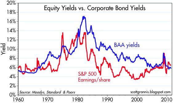 4. El beneficio por acción del conjunto del índice S&P 500 sigue siendo más alto que la rentabilidad de los bonos corporativos. Este hecho es una rareza y un sinsentido a no ser que el mercado esté muy asustado y prefiera una rentabilidad fija y la preferencia dentro de la estructura de capital del negocio a participar plenamente de los beneficios empresariales y poder disfrutar de las revalorizaciones potenciales que ofrece la renta variable.