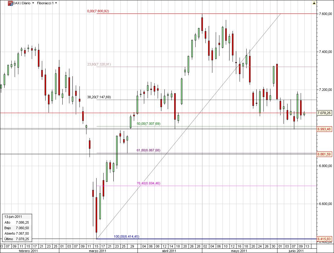 El Dax tiene su principal soporte en los 7000 puntos que aparte de realizar un doble suelo junto con el mínimo de abril, se encuentra también el fibo 50 desde el mínimo de marzo. En caso de perder ese nivel podría ir hasta el 61,8 en los 6861 puntos.