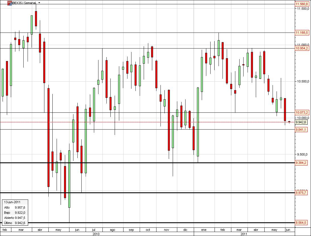 El Ibex-35 ha perdido los 10 000 puntos, lo que deja un panorama poco positivo. El principal nivel del índice español se encuentra en los 9384 puntos, aunque en los 9800 podría aguantar. A parte, los niveles enteros habrá que tenerlos en cuenta. Finalmente añadir que la zona de los 9 500 puntos por el rebote de la velas podría ser otro punto a tener en cuenta.