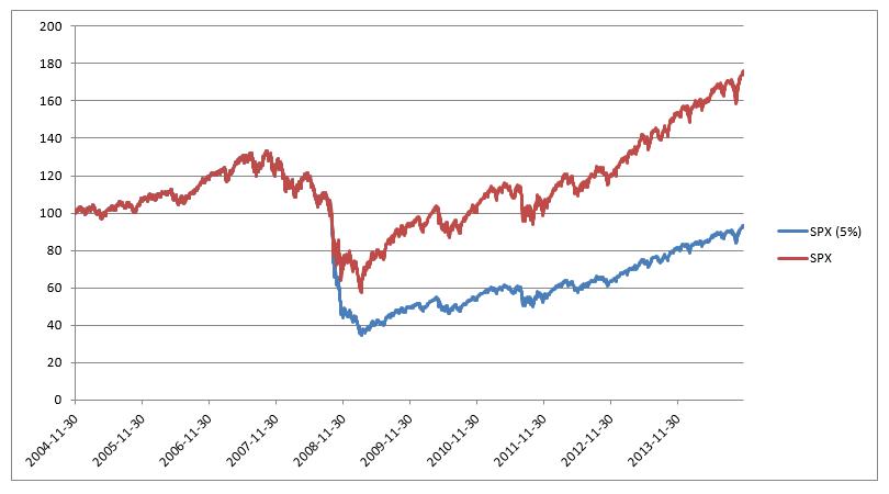 Como ejemplo de ello, puedes ver lo que pasaría si en los 10 últimos años nos hubiéramos perdido las 9 sesiones en las que el SP500 ha subido más de un 5%. Sé que no es una referencia que se pueda aplicar siempre, pero sí para tener en cuenta que los días muy alcistas te pueden marcar la rentabilidad a largo plazo. En la imagen un 76.09% el SP500 por un -6.77% del SP500 menos esas 9 sesiones.