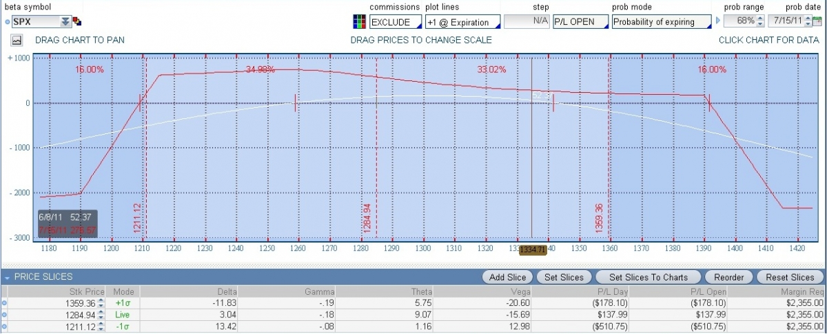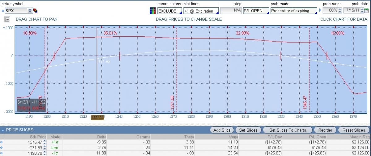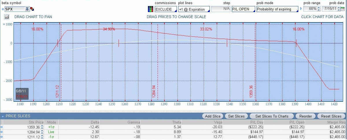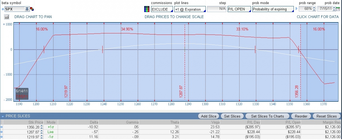 La posición me queda con 460$ de crédito y 2040$ de margen para un contrato. Los strikes quedan en 1190-1215-1390-1415 para vencimiento de Julio. La Iron Condor es contra el SPX.