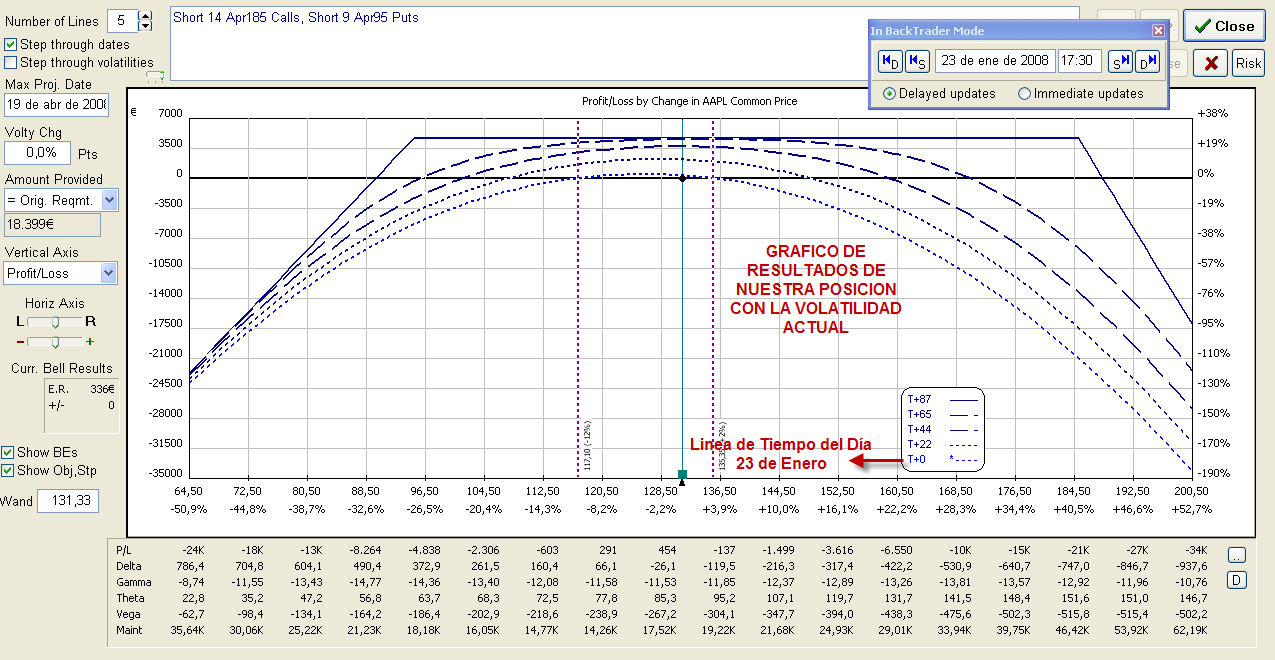 En el siguiente gráfico podemos apreciar también cómo la estrategia que hemos utilizado ( Cuna vendida) ciertamente ha encontrado su escenario más propicio y ha evolucionado día tras día como pretendiamos. Deciamos al principio que necesitábamos una estrategia que permitiera al mercado un razonable rango de movimiento tanto al alza como a la baja. Vemos que lo hemos conseguido pues en el momento del cierre el mercado debía de subir o bajar más de un 10% para hacer que nuestra posición entrara en pérdidas de nuevo.