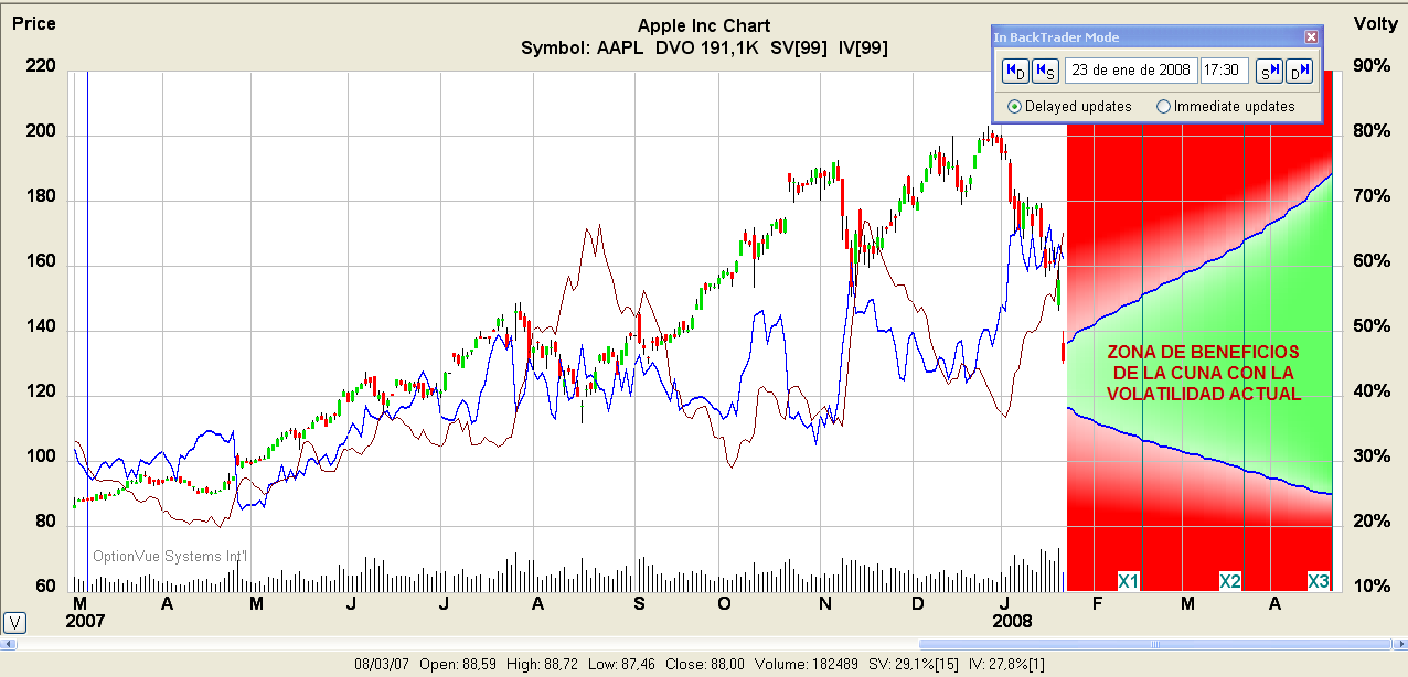Consultando mi diario de trading un buen ejemplo de lo que comento fue Apple en Enero de 2008. Si comparamos su Volatilidad Implícita con su Volatilidad Histórica es fácil saber porqué. Su Volatilidad Implícita era superior al 99% de las Volatilidades Implícitas que había marcado desde que teníamos histórico. Por tanto, era bastante probable que en un corto período de tiempo dicha volatilidad descendiera de forma considerable. Por tanto, buena oportunidad para vender Volatilidad Implícita.