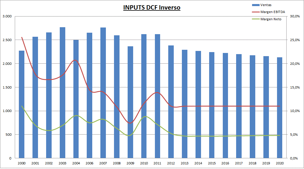 Como mi entusiasmo con el largo en TF1 roza lo depresivo, voy a recordarme por qué estoy comprado en TF1. En el siguiente gráfico podéis ver la evolución de las ventas, margen EBITDA y margen EBIT desde el año 2000. A partir de 2011, son las estimaciones de mi modelo DCF inverso. Con este modelo intento estimar qué escenarios están descontados en el precio. Esta vez he optado por dejar fijo un margen EBITDA que me parece sostenible (un 11,00% - bastante por debajo del consenso), que trae aparejado un margen neto a futuro del 4,70%, también bastante por debajo del consenso.