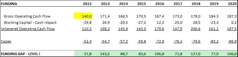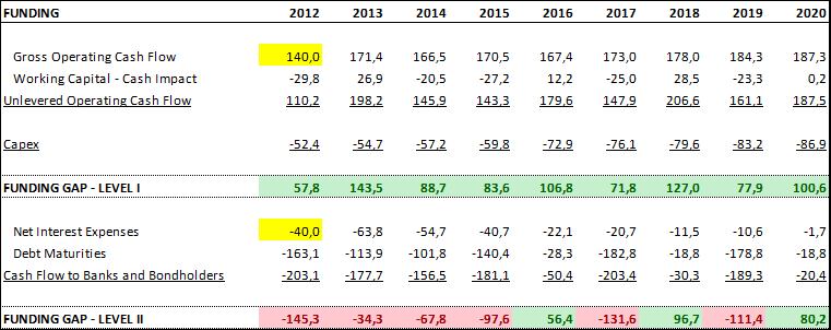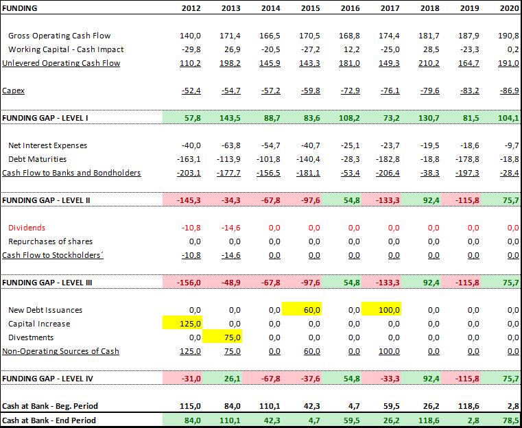 Como hemos comentado, las operaciones de Pescanova, una vez completado el proceso inversor (y matizando las proyecciones por los anteriores factores de riesgo), son capaces de generar Free Cash Flow positivo, calculado como Unlevered Operating Cash Flow (caja operativa antes de pagar intereses) menos Capex. Este nivel “operativo” queda resumido en el Nivel I de nuestro cuadro de financiación. Como podemos ver, asumiendo como válido las proyecciones operativas comentadas en el punto anterior, la compañía es capaz de generar FCF operativo positivo. Esto es condición necesaria, aunque no suficiente.