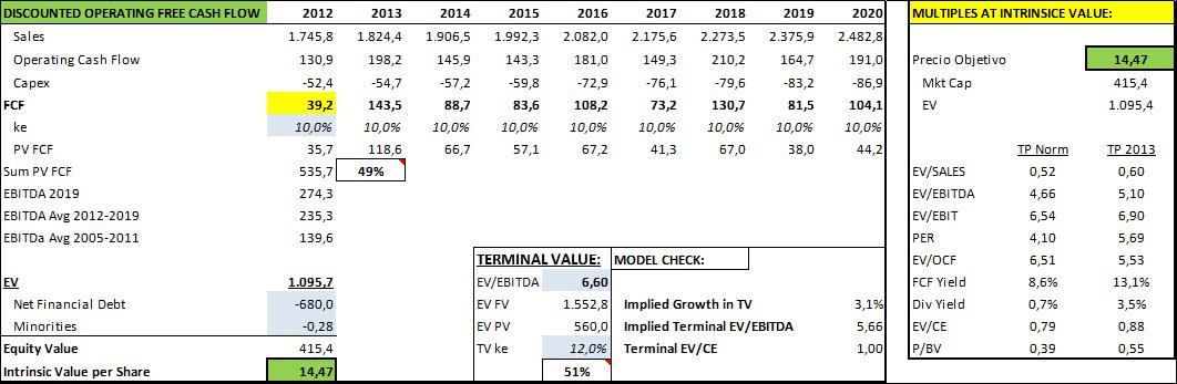 A continuación podéis ver nuestro modelo DFC y los múltiplos implícitos a los que cotiza. En el modelo DCF hemos estimado primero el escenario operativo descrito anteriormente que está implícito en el precio y hemos ido ajustando los múltiplos hasta alcanzar la cotización actual (el típico modelo DCF inverso). Para estimar los múltiplos implícitos, hemos tomado dos columnas: TP Norm y TP2013. En el caso del PER, tenemos en la columna TP Norm que a los precios actuales cotiza a 4,10x el beneficio neto medio desde 2012 a 2020 (en la columna TP Norm trabajamos con la media de beneficios, cash flow, EBITDA, etc que esperamos entre 2012 y 2020, con el objetivo de tener múltiplos normalizados). En la segunda columna utilizamos también el precio actual, pero los múltiplos se calculan con el beneficio, cash flow, EBITDA, etc. Esperados para 2013.