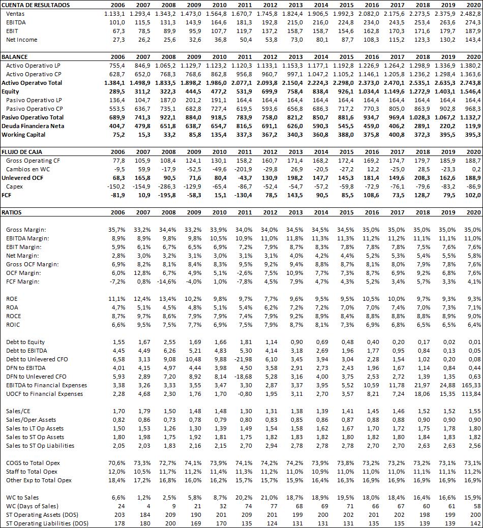 En el cuadro anterior vemos cómo la caja generada por el negocio no es suficiente para pagar principal e intereses a los acreedores financieros. Solamente en 2016, 2018 y 2020 la caja del negocio alcanza para pagar intereses + principal, ya que son años en los que los vencimientos de deuda son muy bajos. En el resto de años, el negocio no puede pagar a sus acreedores. Esto es lo que explica que en 2009 y en 2012 hayan tenido que ampliar capital.