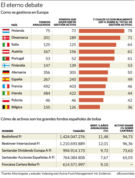 En la siguiente figura observamos las conclusiones del estudio mencionado anteriormente junto con datos de Morningstar, todo ello recopilado por elEconomista. La figura, lista los fondos que dicen ser activos, desglosado por países, y después da información sobre cuántos de los que dicen ser activos lo son en realidad. Son considerados gestión activa aquellos fondos que tengan un Active Share superior al 60% respecto a su índice, lo que significa que la suma entre las variaciones de ponderación y empresas diferentes entre el fondo y el índice debe ser superior al 60%.