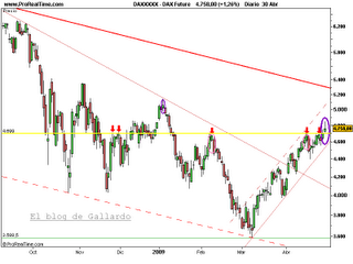 Hubiera sido mucho más positivo tener una vela de cuerpo real grande que rompiera esa zona resistiva con contundencia; pero, en cualquier caso, la ruptura de esa resistencia debería llevar al futuro del Dax a niveles de 5.000 enteros, e incluso al techo del canal alcista y a la proximidad de la directriz bajista de medio plazo, salvo que el lunes se cierre por debajo de los mínimos de la estrella. El primer indicio lo tendríamos si el lunes se ven precios sostenidos inferiores a 4.700 puntos; entonces podríamos encontrarnos ante una ruptura falsa sumada a una pauta de giro bajista.