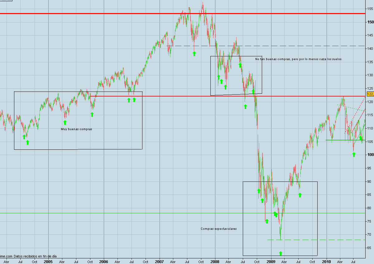 Este ejemplo lo he hecho dividiendo entre 12, para relativizar un poco mas la cantidad a invertir, en vez de 12 utilizad el 24. Se puede observar que es un sistema completamente “contrarian”, porque compra en suelos, y además compra más cantidad en los años en los que se produce una salida de capitales de la bolsa, como ejemplo tenéis el año 2008.