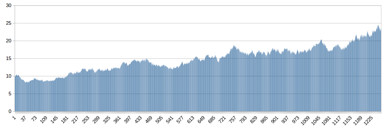 Aquí tenéis algunos de esos gráficos, generados aleatoriamente para un periodo de 5 años (1250 sesiones). Como podéis observar, aparecen todo tipo de "tendencias", incluidas agunas de muy largo plazo,... ¿¿¿ no os parece ???