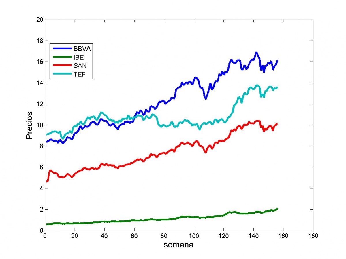 El siguiente gráfico muestra la evolución de los precios de estas empresas a lo largo de 3 años determinados (156 semanas). Nosotros estamos en la semana 156 del gráfico y queremos invertir nuestro dinero de la semana 157 a la semana 180. Simplemente por ilustrar, basaremos nuestra decisión en la información proporcionada en el gráfico.
