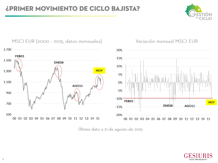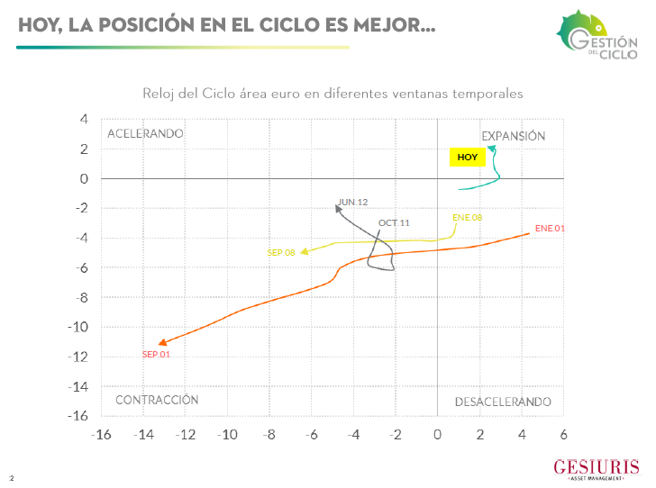 El análisis de la información adelantada de actividad en el área euro sigue apuntando a un fondo económico en fase expansiva. Y esta es una diferencia importante cuando revisamos los entornos previos en los que el MSCI EUR sufrió una caída mensual superior al 10% (agosto 2011, enero 2008, febrero 2001). En todos ellos, tal como detallamos en el gráfico inferior, nuestro análisis sugería una actividad económica en fase de desaceleración y transitando hacia contracción. Hoy está en expansión.