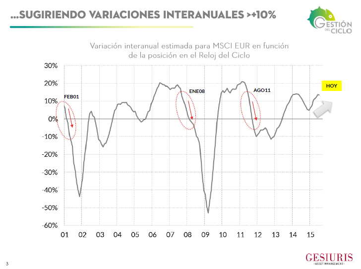Y esta fase en expansión es la que sugiere que la velocidad interanual del MSCI EUR debería estar ligeramente por encima del +10% (ver resultado del análisis estadístico en el gráfico inferior). Muy diferente era la evolución en 2011, 2008 o 2001, cuando la velocidad estimada descendía bruscamente hasta llegar a niveles negativos de variación interanual estimada para el MSCI EUR. Una primera señal de alerta que hoy no observamos.
