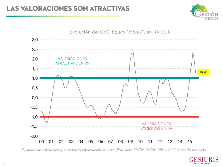 El anclaje de tipos de interés en mínimos (con la deuda alemana a 10 años por debajo del 1%) está ayudando, y mucho, a desplazar valoración relativa hacia los mercados de acciones desde los mercados de deuda. Si a ello le sumamos una gradual recuperación del ciclo de crédito y demanda interna (más apalancamiento y soporte a márgenes) el resultado es de un entorno de valoraciones atractivo para la renta variable europea. Muy diferente era la foto en 2001 o 2007, cuando el GdC equity value alertaba de un sobrecalentamiento importante en valoración.