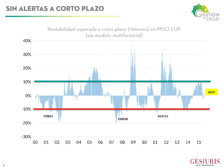 Con todo, siendo conscientes de la complejidad y las limitaciones, encontramos tres variables con información relevante y consistente a la hora de aproximar la rentabilidad esperada en la renta variable europea: (i) pendiente 3m – 10 años en curva de deuda alemana, (ii) rentabilidad por dividendo – TIR 10 años deuda alemana y (iii) ratio Precio Valor Contable ajustado por ROE normalizado. Con información de estas tres variables proyectamos la rentabilidad esperada a corto plazo (+6 meses), y la evolución de esa previsión es lo que presentamos en el siguiente gráfico. Hoy, la rentabilidad esperada a 6 meses vista es del +3%. En agosto de 2011, enero de 2008 y febrero de 2001 la rentabilidad esperada por el modelo era del -15%.