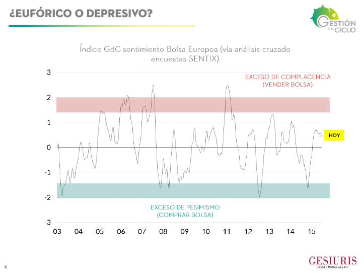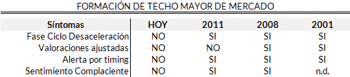 Hoy, a diferencia de 2011 y 2008 (sin datos para 2001), nos encontramos ante un sentimiento neutral, lejos de los excesos de complacencia que se observan en la formación de techos mayores.