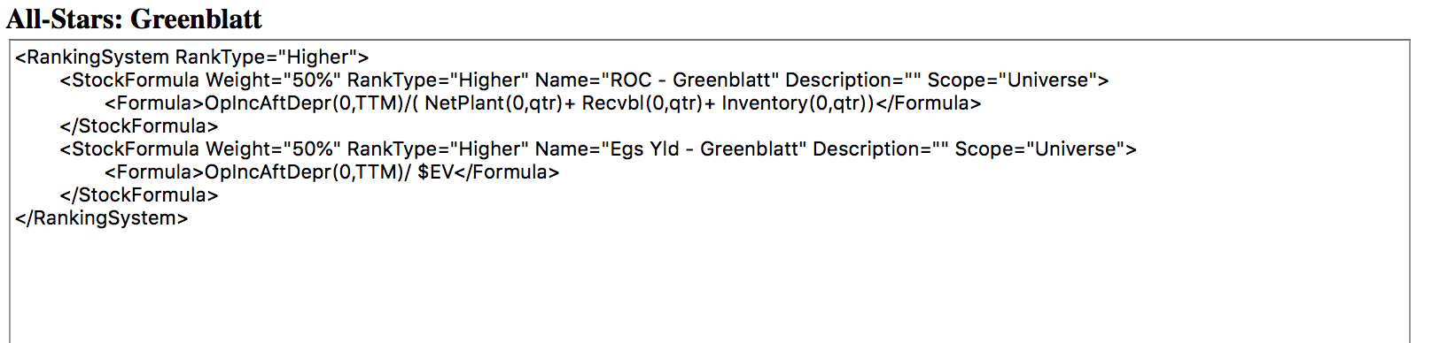 La segunda forma es usar el sistema de ranking de empresas que sale en la plataforma que utilizo para hacer los backtests (pego el código aquí abajo), y reproducir el sistema de Greenblatt en las condiciones de compra y venta.