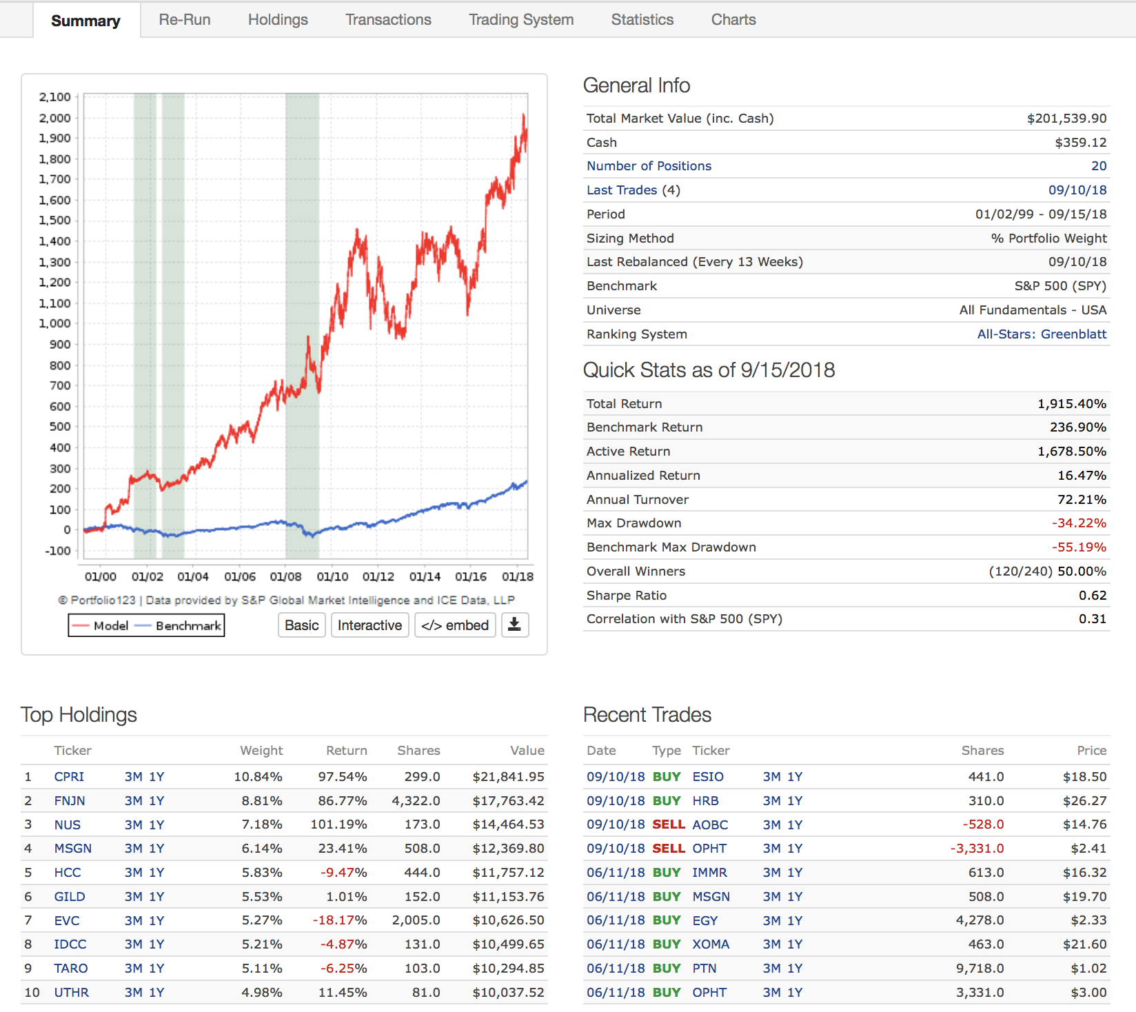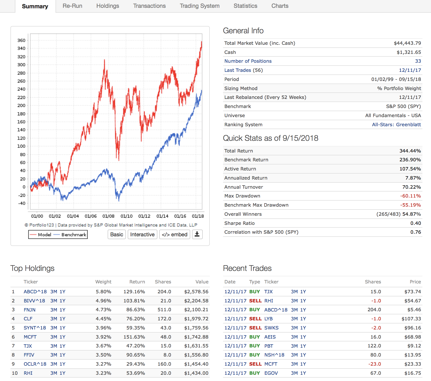 La última forma es tomar el sistema de Greenblatt como punto de partida, e intentar mejorarlo. Las mejoras que he realizado son ligeras. Una condición de market timing para reducir el drawdown, quitar la condición de P/E, si ranking menor de 70 vender, si hemos ganado más del 100% también vendemos y rebalanceo cada 13 semanas. That's all.