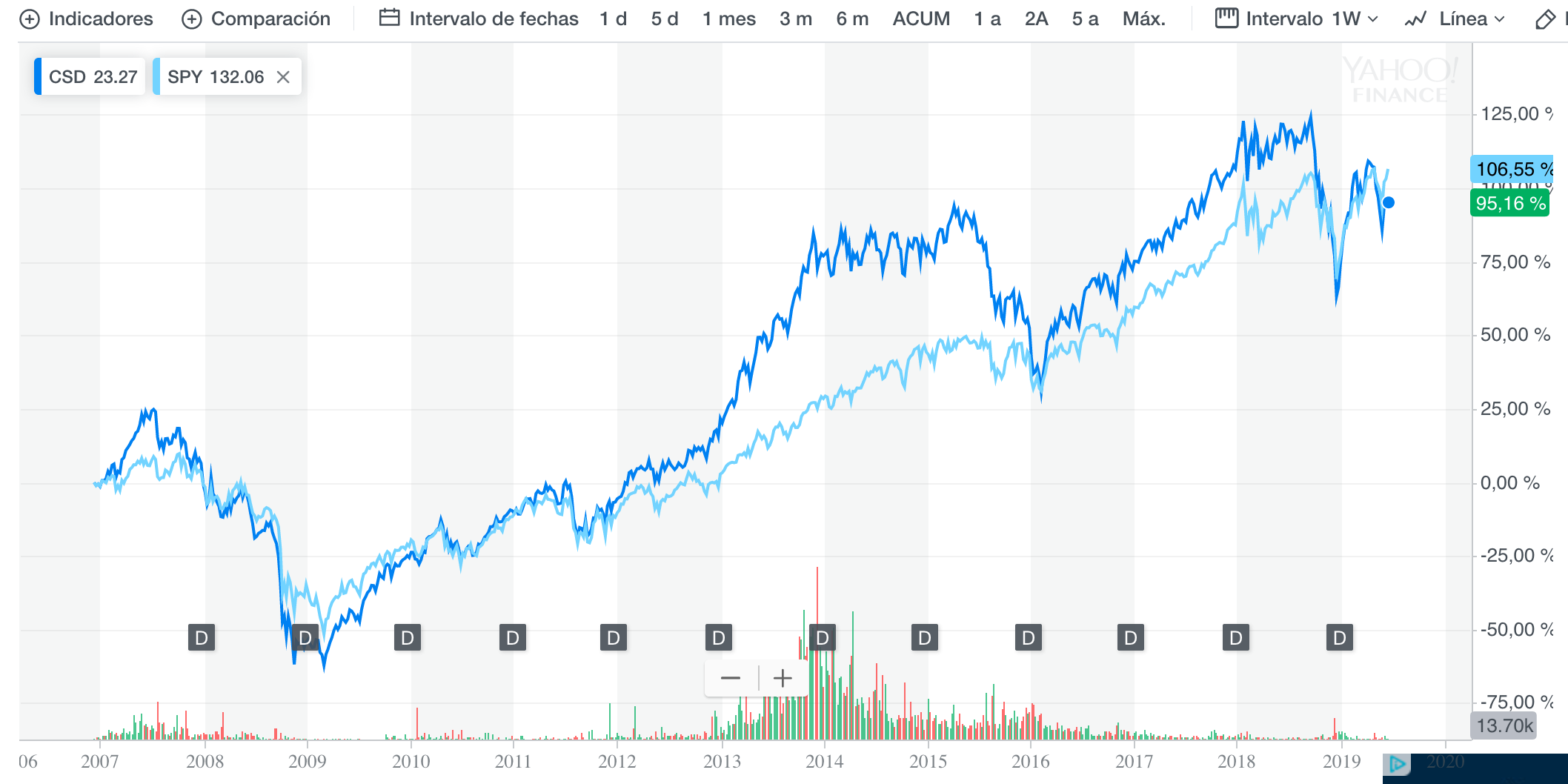Luego me entere que hay un ETF que solo compra spinoffs, el CSD, había otro con un ticker más “cool”, pero lo han cerrado, supongo por falta de inversión. SPUN se llamaba. CSD comenzó a cotizar en 2006, y actualmente lleva un 17% de rendimiento anualizado. Este si que superaba al S&P500, aunque no últimamente, cosa que se ajusta a mi repaso de las últimas spinoff.