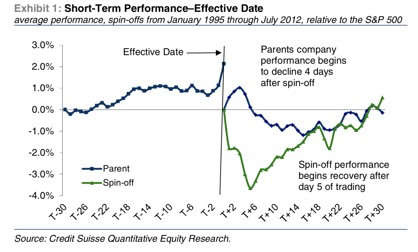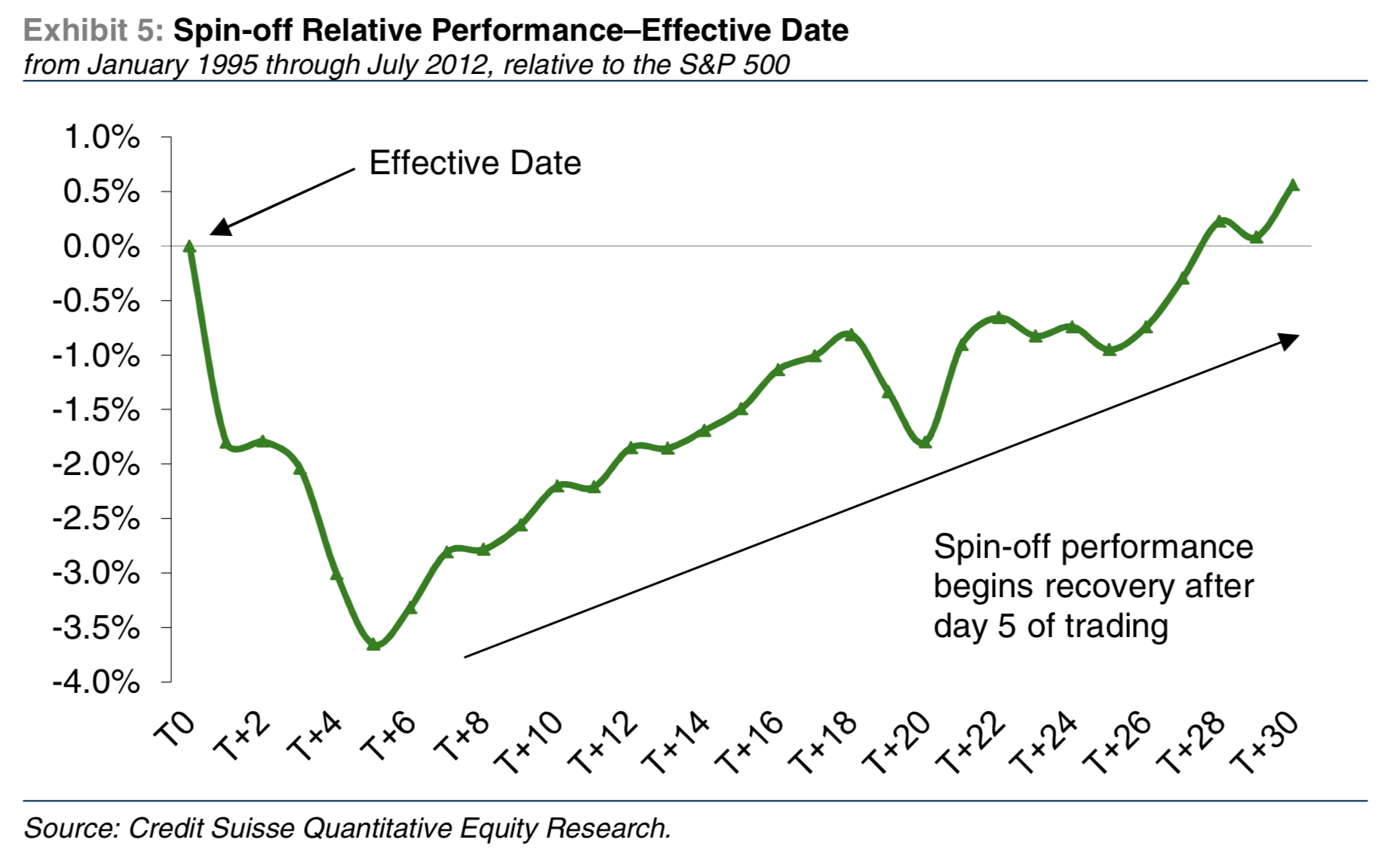 The spin-off portfolio began declining immediately following the effective date, bottoming out on day 5. The spin-off portfolio recovered to breakeven by day 28.