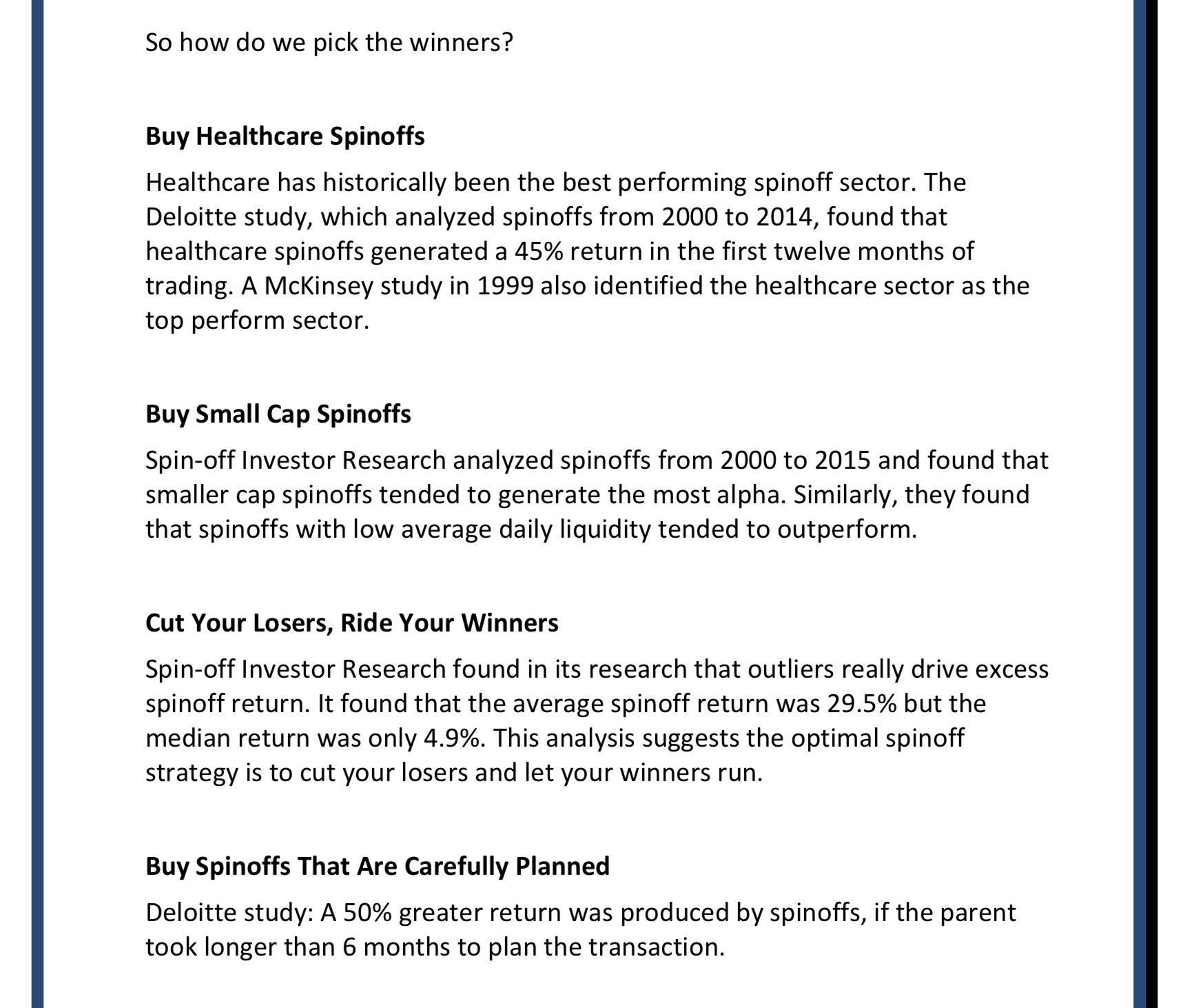 Best performing sector for Spinoffs was Healthcare. Delivering average returns of 45% over the first year.