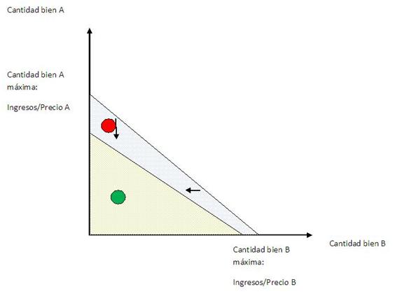 La nueva situación implicaría que por tanto, si destinásemos toda nuestra renta al bien A, sería una cantidad menor, (porque los ingresos suben un 5%, mientras el precio sube un 10%); mientras que si destinásemos toda nuestra renta al bien B, podríamos consumir mayor cantidad del bien; por tanto el área que representa lo que podemos consumir cambia de la siguiente forma: