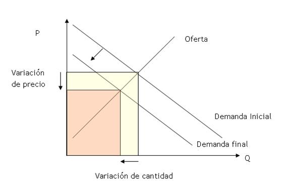 Lo que ocurriría es que en este mercado, tanto la demanda del bien, como el precio caerían; lo cual significa invariablemente que la facturación de las empresas que producen el bien se reduce y pasa de ser el área grande al área sombreada pequeña.