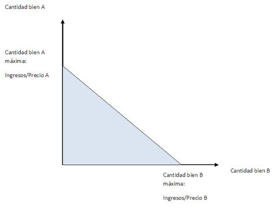 Cualquier consumidor cuando trate de decidir su consumo entre cualquier combinación de estos dos bienes, tiene que tener claro que se moverá a lo largo de la zona marcada en azul. Puede consumir como máximo toda su renta en el bien A, (de forma que consumiría tantas unidades como el resultado de dividir toda su renta entre el precio del bien A); el mismo razonamiento con el producto B, o puede moverse en una combinación.