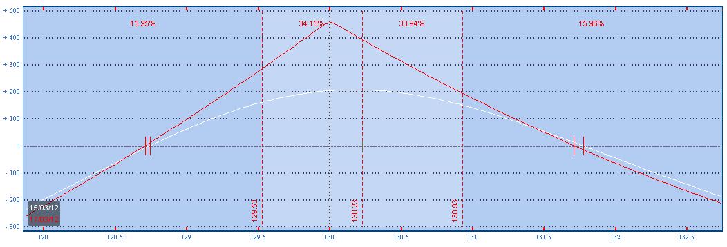 Adjunto el gráfico de riesgo en el momento del cierre de la operación y según comentario del post del 15 de marzo. El beneficio es de 30$ por cada 217$ invertidos, es decir, una rentabilidad del 13.8%.