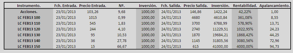 En esta tabla tienes diferentes inversiones con diferentes instrumentos, y sus respectivas rentabilidades y apalancamientos. Todas las operaciones parten de una misma cantidad de $1000. En el caso de una operación con acciones el beneficio es de un 42%. Con una operativa con apalancamiento x10 (futuros por ejemplo) pasaría a un 420% (no recogida en la tabla), y en el caso más extremo con Long Call muy fuera de dinero con strike 150, el beneficio es de un 4000%. Las comisiones no se han tenido en cuenta, pero se ha tomado el caso más desfavorable en la horquilla.