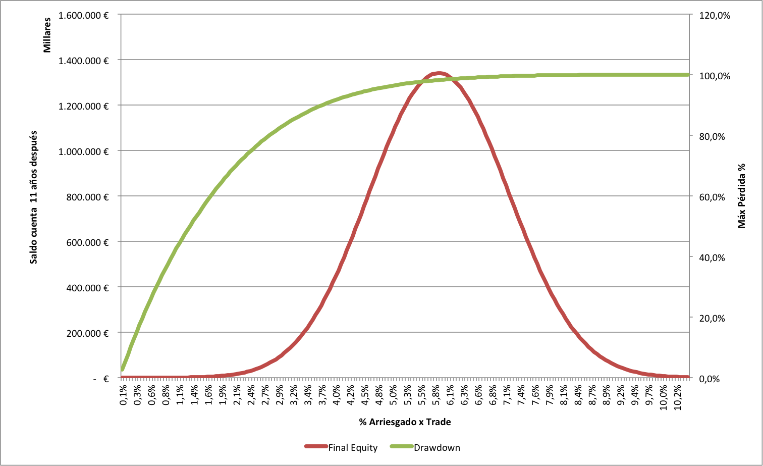 Si me pregunto cuánto arriesgar en cada operación, dependerá del estudio de los diversos escenarios que me puedan llevar el riesgo asumido y en definitiva de mi propia tolerancia a asumir pérdidas importantes o la ruina total.
