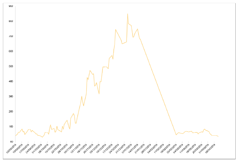Uno de los productos más negociados en Milán fue un Turbo Warrant Ilimitado BEST Bear o Put y a continuación analizaremos los precios en valores absolutos desde el 3 de septiembre de 2018 hasta el cierre del viernes 12 de abril de 2019. Las gráficas de la cotización del subyacente se pueden apreciar en la explicación del Turbo Warrant Ilimitado y comparar la evolución en valores absolutos de la cotización del subyacente y del Turbo BEST.