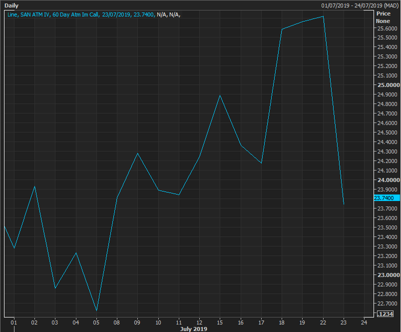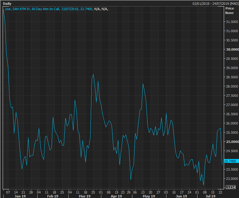 La volatilidad implícita y el tiempo a vencimiento siempre se tendrán que analizar simultáneamente, debido a que, si nos encontramos con apenas tiempo hasta vencimiento (imaginémonos 5 minutos) y haya un cambio en la volatilidad implícita muy alto, al subyacente no le dará tiempo a variar lo suficiente para que se vea afectado un Warrant o una opción. O en el caso contrario, el vencimiento es en muchos años (es decir, tiempo casi infinito) pero la volatilidad es cerca a nula. Observemos a continuación, como ha evolucionado la volatilidad implícita de Banco Santander, S.A. este mes de julio hasta el día de hoy, 24 de julio.