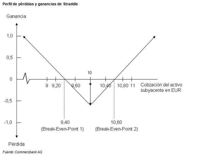 Para los Warrant Call, teniendo en cuenta que la cotización del subyacente se sitúa en 10€ y el Warrant At the money, tendrá un punto Break-even (es la situación en la que tendremos pérdidas y ganancias iguales a 0) en 10,30€ mientras que si solamente nos fijamos en el Warrant Put, tendrá el punto Break-even en 9,70€. Al ser una estrategia conjunta, tendremos que sumar y restar ambas primas para conocer los puntos Break-even de la estrategia. Siendo:
