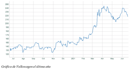Como se ve en el Gráfico adjunto, la subida se inicia a partir de noviembre de 2020, con la aprobación de las vacunas, y se aceleró en marzo de este año, al confirmarse la reapertura de las economías europeas y la buena marcha de la recuperación en China. Además en el caso particular de Volkswagen, la compañía anunció a mediados de marzo una profunda transformación con el objetivo de convertirse en una compañía líder en software, para lo cual lanzó su filial VW Car Software, anuncio que propició una fuerte subida como analizamos en el Gráfico semanal del 22 de marzo de 2021.