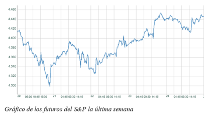 El Gráfico muestra como los futuros del S&P cayeron con fuerza el pasado lunes ante la amenaza de que Evergrande suspendiese sus pagos a los acreedores. El Eurostoxx y el Nasdaq cayeron un 2,1% en la sesión del lunes y el S&P y el Dow Jones el 1,7%. Pero ya al final de la sesión se inició la remontada que ha llevado finalmente al S&P a subir un 0,5% en la semana.