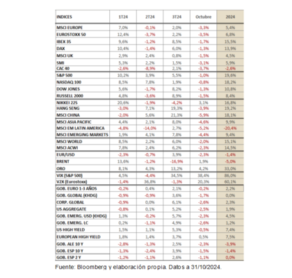 En este contexto, las bolsas cierran octubre con correcciones generalizadas, aunque de distinta intensidad según geografías, con mejor comportamiento relativo en EE.UU., apoyado por una actividad económica más sólida, frente a un peor tono en Europa y Emergentes. Así, en EE.UU., S&P -1,0% en usd (+1,6% en eur), Nasdaq -0,8% (+1,8% en eur) y Russell -1,5% (+1,1% en eur); en Europa, Eurostoxx -3,5%, Dax -1,3% e Ibex -1,7%; por su parte, Emergentes -4,4% en usd (-1,9% en eur), lastrado tanto por China -5,9% (-3,5% en eur) tras el buen comportamiento del mes precedente y a la espera de más estímulos que afronten el problema clave de su economía (débil consumo privado) y Latam-5,2% (-2,7% en euros). Aún con todo, las revalorizaciones en el acumulado del año siguen siendo relevantes: en divisa local, S&P +19,6%, Nasdaq +18,2%, Russell +8,4%, Eurostoxx +6,8%, Dax +13,9%, Ibex +15,5% y Emergentes +9,4% (China +18,1% pero Latam -20,4%).