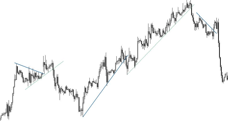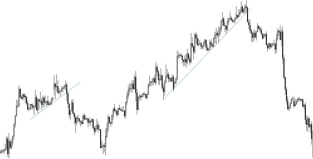 Podéis observar como la línea verde si es una tendencia según nuestra definición (existen al menos 3 toques a la línea por parte del precio), por el contrario la línea roja goza solamente de 2 toques por parte del precio. Incluso aquí algún puritano podría hablar de que la línea roja es tocada tres veces, pero no considero las dos velas casi seguidas que hay al final como toques independientes.