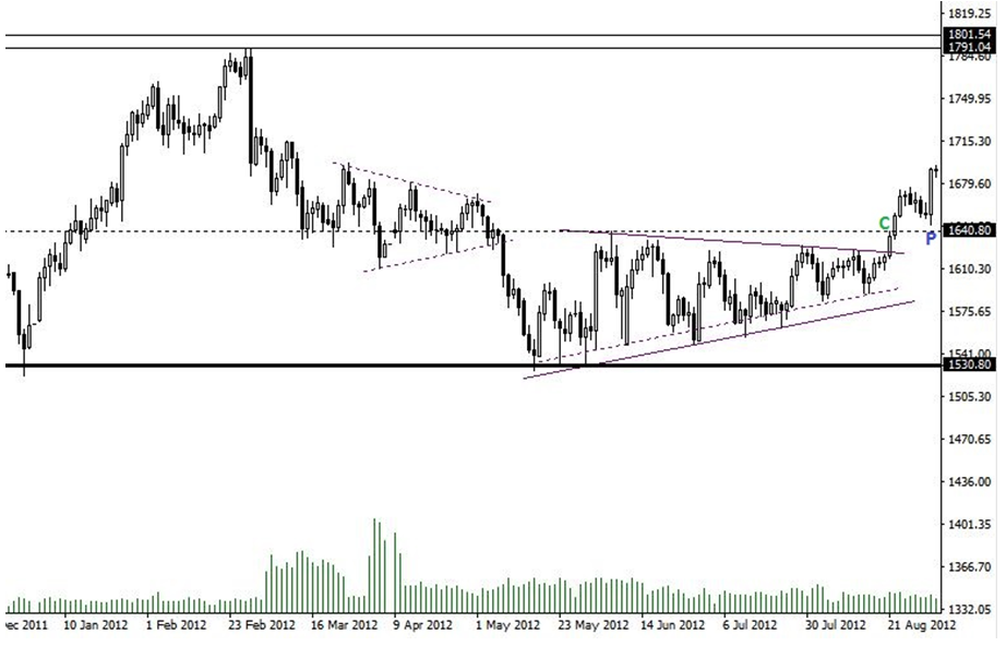 Aposté por dejar escapar algunos pips y no comprar hasta tenerlo muy claro. Esperé a la rotura de los máximos para tener una confirmación clara de a dónde iba el oro después de la guerra que se había montado en la zona 1.550/1.600.