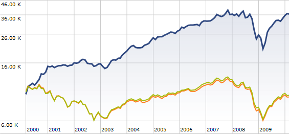 Gráfico (fuente morningstar) comparativo de la evolución de su fondo de inversión Fairholme(azul) y el S&P 500 (verde). Fairholme ha obtenido una rentabilidad media anual de 14,28% durante los últimos diez años, ¡¡ una auténtica barbaridad !!, pues el S&P ha obtenido durante el mismo periodo de tiempo un -0'73%. A esto se le llama batir de forma consistente al mercado.